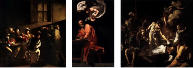 左 カラヴァッジョ、聖マタイの召命、1598〜1601年頃、カンヴァス、油彩、322×340cm、ローマ、サン・ルイージ・デイ・フランチェージ聖堂コンタレッリ礼拝堂