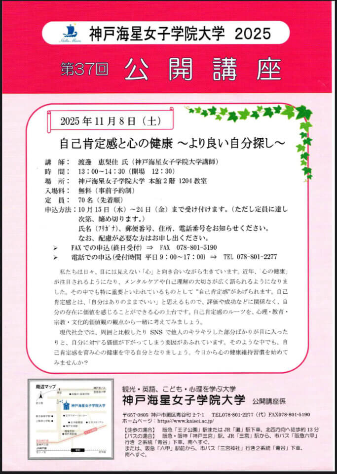 お知らせ HOME / お知らせ / 神戸海星女子学院大学「第37回公開講座」のお知らせ 2025年10月9日掲載 青谷会本部 お知らせ 神戸海星女子学院大学「第37回公開講座」のお知らせ 関連記事 神戸海星女子学院大学「第34回 公開講座」のお知らせ 神戸海星女子学院大学 大学祭 ~栞~ 神戸海星女子学院大学「社会人入試のお知らせ」 神戸海星女子学院大学 大学祭 2024 神戸海星女子学院大学 大学祭 2025