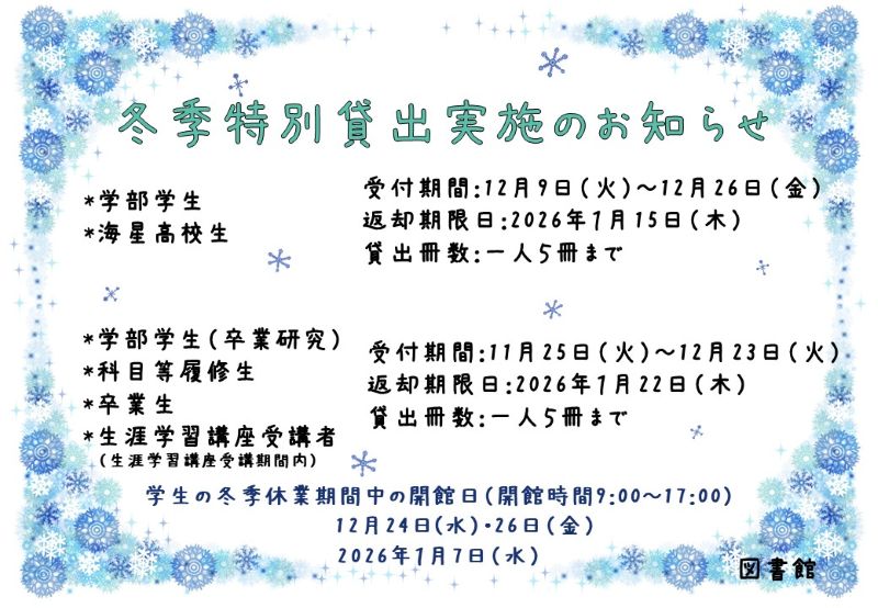 *学生の冬季休業期間中の開館日は12月24日、26日、2026年1月7日です。